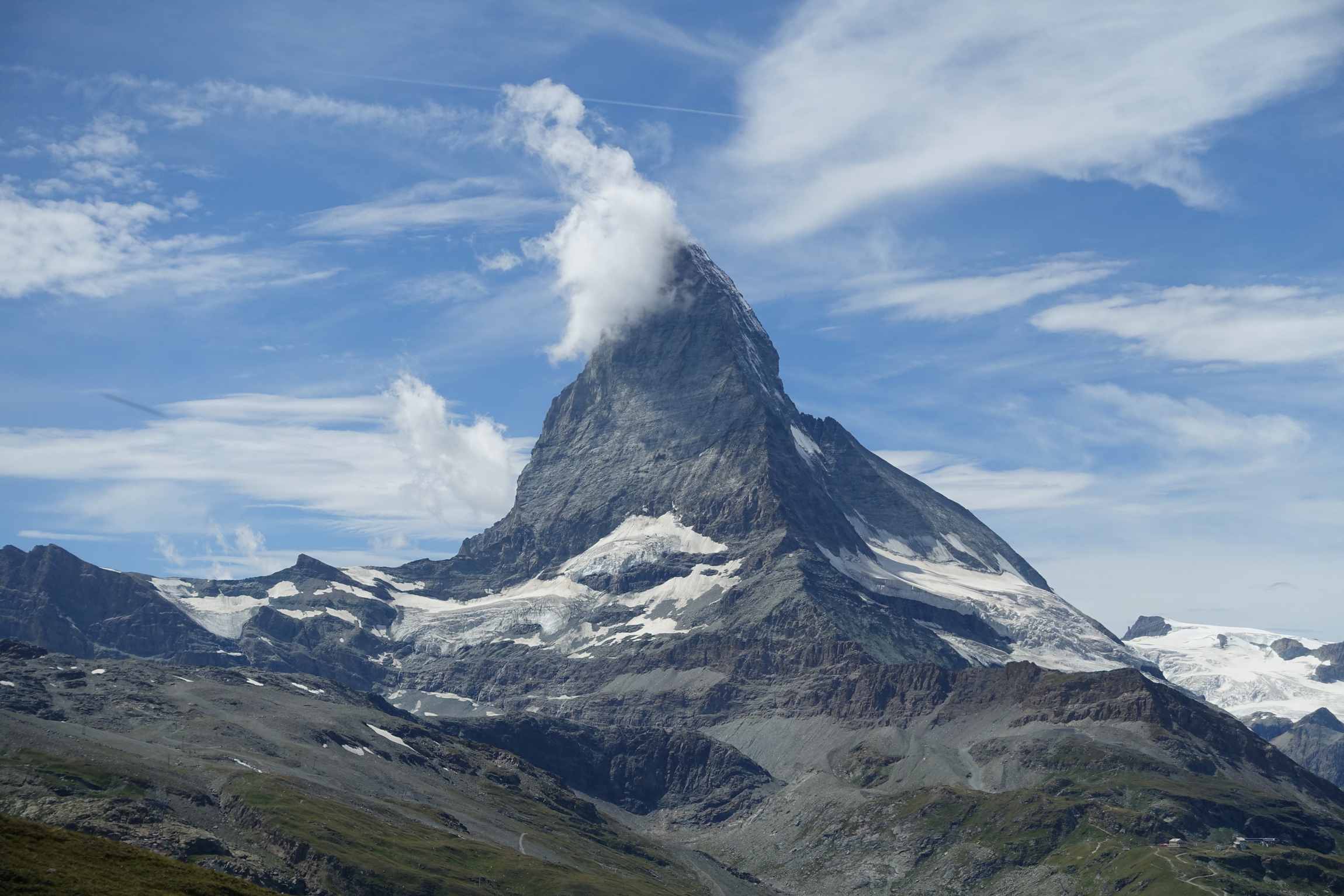 W zimie oglądałem serial The Horn - o pracy alpejskiego zespołu ratowniczego Air Zermatt. Teraz widzę ich lądowisko na żywo - znowu radocha :) Było tam wiele pięknych ujęć na Matterhorn, a ta piękna góra zaraz zaczyna wyłaniać się na horyzoncie - i zostanie z nami już do końca dnia.